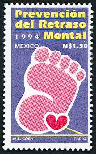No. Scott: 1871 -- Año de Emisión: 1994 -- Valor Facial: 1.30 Nuevos Pesos -- Violeta, rojo y amarillo -- Perforado: 14 -- Tipo de Impresión: Huecograbado Timbre Postal Mexicano en colores violeta, rojo y amarillo, en la imagen se observa la huella de un pie de un niño pequeño, sobre de ésta hay un corazón pequeño en color rojo, en la parte superior de la imagen está escrito "Prevención del Retraso Mental, "MEXICO 1994", el valor facial sde "N$1.30" y en la parte inferior "M.L. CORA T.I.E.V.". Para más información favor de dirigirse a biblioteca@mufi.org.mx