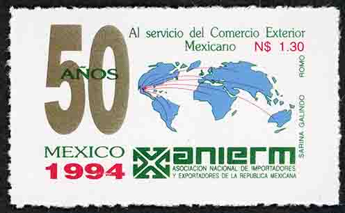 No. Scott: 1868 -- Año de Emisión: 1994 -- Valor Facial: 1.30 Nuevos Pesos -- Azul, verde, rojo y oro -- Ruleteado: 14 -- Tipo de Impresión: OffsetTimbre Postal Mexicano en colores azul, verde, rojo y oro, del lado izquierdo a parece impreso "50 AÑOS", del lado derecho se observa un Mapamundi y algunas líneas curvas señalando al pais de México, en la parte superior está escrito "Al Servicio del Comercio Exterior Mexicano", el valor facial de "N$1.30", del lado lateral derecho "SARINA GALINDO ROMO" en la parte inferior "MEXICO 1994" y "ASOCIACION NACIONAL DE IMPORTADORES Y EXPORTADORES DE LA REPUBLICA MEXICANA".