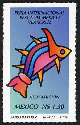 No. Scott: 1874 -- Año de Emisión: 1994 -- Valor Facial: 1.30 Nuevos Pesos -- Multicolor -- Perforación: 14 -- Tipo de Impresión: Offset Timbre Postal Mexicano multicolor, la imagen presenta una ilustración surrealista de un pez multicolor, en la parte superior está escrito "FERIA INTERNACIONAL, PESCA 94, MEXICO-VERACRUZ", en la parte inferior "AYOYAMICHIN", "MEXICO", el valor facial de "N$1.30" y "AURELIO PEREZ ROMO 1994". Para más información favor de dirigirse a biblioteca@mufi.org.mx