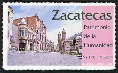 No. Scott: 1870 -- Año de Emisión: 1994 -- Valor Facial: 1.30 Nuevos Pesos -- Rosa, azul y negro -- Ruleteado: 14 -- Tipo de Impresión: Offset Timbre ¨postal Mexicano en colores rosa, azul y negro, en la imagen se observa la Plaza de Armas y la Catedral del Estado de Zacatecas, sobre la estampilla está escrito "Zacatecas", "Patrimonio de la Humanidad", el valor facial de "N$1.30" y la palabra "MEXICO". Para más información favor de dirigirse a biblioteca@mufi.org.mx