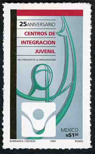 No. Scott: 1876 -- Año de Emisión: 1994 -- Valor Facial: 1.30 Nuevos Pesos -- Negro, Verde y Carmín -- Ruleteado: 14 -- Tipo de Impresión: Offset Tombre Postal Mexicano en colores negro, verde y carmIVERSARO ín, en la imagen se observa parte de una silueta humana hecha con líneas rectas y curvas, sobre la misma está impreso el logotipo de los Centros de Integración Juvenil, en la parte superior está escrito "25 ANIVERSARIO", "CENTROS DE INTEGRACION JUVENIL", "EN ATENCION DE LA DROGADICCION", en la parte inferior "MEXICO", el valor facial de "N$1.30" y "BARRANCA /DEHEZA 1994, ROMO". Para más información favor de dirigirse a biblioteca@mufi.org.mx
