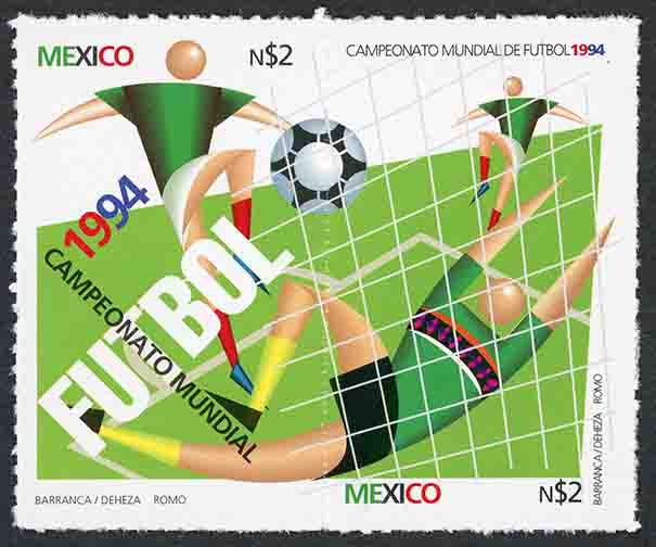 No. Scott: 1873 a y b -- Año de Emisión: 1994 -- Valor Facial: 2.00 Nuevos Pesos -- Multicolor -- Ruleteado: 14 -- Tipo de Impresión: Offset Dos timbres Postales de Mexico multicolores, tipo CSE-TENANT, las imágenes muestran ilustraciones surrealistas, en la que aparecen tres jugadores de futbol, uno de ellos está a punto de lanzar el balón, aparece otro jugador en frente de una portería queriendo atrapar la pelota y el tercer futbolista está atento a la jugada, en ambas estampillas está escrito "MEXICO", el valor facial de "N$2.00", "CAAMPEONATO MUNDIAL DE FUTBOL 1994" y "BARRANCA / DEHEZA ROMO". Para más información favor de dirigirse a biblioteca@mufi.org.mx
