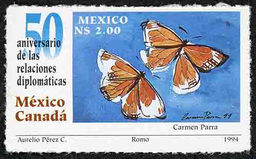No. Scott: 1877 -- Año de Emisión: 1994 -- Valor Facial: 2.00 Nuevos Pesos -- Azul, negro y Café -- Ruleteado: 14 -- Tipo de Impresión: Offset Timbre Postal Mexicano en colores azul, negro y café, en la imagen se observas dos pequeños insectos con alas color naranja, venas y bordes negros, decoradas por manchas blancas, sobre la estampilla está escrito "50 Aniversario de las relaciones diplomáticas México-Canada", "MEXICO", el valor facial de "N$2.00" y "Aurelio Pérez C., Romo 1994". Para más información favor de dirigirse a biblioteca@mufi.org.mx
