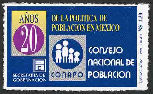 No. Scott: 1878 -- Año de Emisión: 1994 -- Valor Facial: 1.30 Nuevos Pesos -- Azul, gris, amarillo y violeta -- Ruleteado: 14 -- Tipo de Impresión: OffsetTimbre Postal Mexicano en colores azul, gris, amarillo y violeta, en un rectángulo y dentro de un círculo aparece "20 AÑOS", en otro rectángulo se observa el logotipo de la "CONAPO", sobre la estampilla está escrito "DE LA POLITICA DE POBLACION EN MEXICO", "CONSEJPO NACIONAL DE POBLACION", "SECRETARIA DE GOBERNACION", "LAURA RONDA