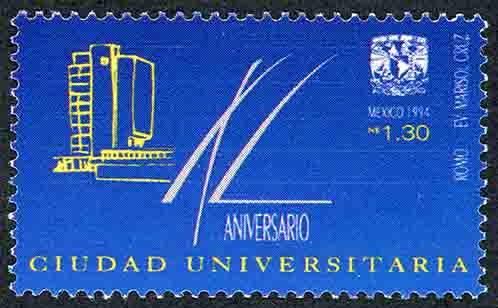 No. Scott: 1887 -- Año de Emisión: 1994 -- Valor Facial: 1.30 Nuevos Pesos -- Azul y amarillo -- Ruleteado: 13 1/2 x 13 1/4 -- Tipo de Impresión: Offset Timbre Postal Mexicano en colores azul y amarillo, la imagen nos muestra una ilustración abstracta, en donde aparece la Torre de Rectoría elaborada con figuras geométricas y líneas rectas, en el centro aparece "XL ANIVERSARIO", "MEXICO 1994", el valor facial de "N$1.30" y "CIUDAD UNIVERSITARIA". Para más información favor de dirigirse a biblioteca@mufi.org.mx