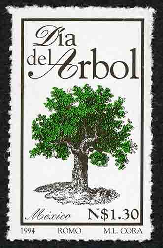 No. Scott: 1880 -- Año de Emisión: 1994 -- Valor Facial: 1.30 Nuevos Pesos -- Verde, Negro -- Ruleteado: 14 -- Tipo de Impresión: Offset Timbre Postal Mexicano en colores verde y negro, en la imagen se observa un árbol frondoso con grandes ramas y hojas muy verdes, tiene un tronco de gran tamaño y de apariencia leñosa, en la parte superior está escrito "Día del Árbol", en la parte inferior "Mexico", el valor facial de "N$1.30"y en la parte infeior "1994, ROMO, M.L. CORA". Para más información favor de dirigirse a biblioteca@mufi.org.mx