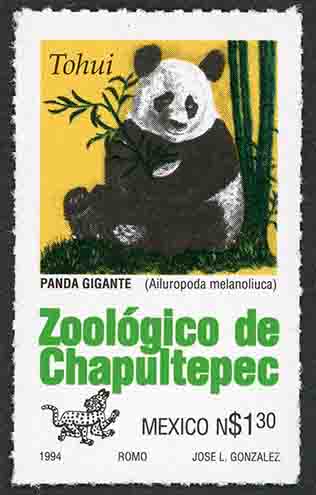 No. Scott: 1882 -- Año de Emisión: 1994 -- Valor Facial: 1.30 Nuevos Pesos -- Negro, amartillo y verde -- Ruleteado: 14 -- Tipo de Impresión: Offset Timbre Postal Mexicano en colores negro, amarillo y verde, en la imagen se observa un animal grande con pelaje blanco y de aspecto lanoso, las patas, hombros, orejas y la zona de los ojos son negras, él está sentado, cerca de dos tallos de bambú, en la parte superior está escrito "Tohui", en medio "PANDA GIGANTE (Ailuropoda melanoliuca)", en la parte inferior "Zoológic de Chapultepec", "MEXICO", el valor facial de "N$1.30" y "1994, ROMO, JOSÉ L. GONZALEZ". Para más información favor de dirigirse a biblioteca@mufi.org.mx