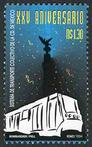 No. Scott: 1883 -- Año de Emisión: 1994 -- Valor Facial: 1.30 Nuevos Pesos -- Multicolor -- Perforación: 13 1/4 x 13 1/2 -- Tipo de Impresión: Offset Timbre Postal Mexicano multicolor, al fondo de la imagen se observa el Monumento a la Independencia, al frente aparece una ilustración abstracta, mostrándo el transporte Metro, en la parte superior está escrito "XXV ANIVERSARIO", el valor facial de "N$1.30", en el costado izquierdo "SISTEMA DE TRANSPORTE COLECTIVO DE LA CD. DE MEXICO" y en la parte inferior "BOMBARDIER / PELL, ROMO 1994". Para más información favor de dirigirse a biblioteca@mufi.org.mx
