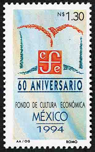 No. Scott: 1884 -- Año de Emisión: 1994 -- Valor Facial: 1.30 Nuevos Pesos -- Verde, azul y negro -- Perforación: 13 1/4 x 13 1/2 -- Tipo de Impresión: Offset Timbre Postal Mexicano en colores verde, azul y negro, en la imagen aparece una ilustración abstracta, mostrando un libro abierto y encima de éste aparece un logotipo, en la parte superior está escrito el valor facial de "N$1.30", en medio "60 ANIVERSARIO", en la parte inferior "FONDO DE LA CULTURA ECONÓMICA", "MEXICO 1994" y "AA / OG, ROMO". Para más información favor de dirigirse a biblioteca@mufi.org.mx