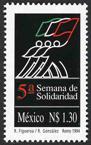 No. Scott: 1886 -- Año de Emisión: 1994 -- Valor Facial: 1.30 Nuevos Pesos -- Negro, verde y rojo -- Perforación: 13 1/4 x 13 1/2 -- Tipo de Impresión: Offset Timbre Postal Mexicano en colores negro, verde y rojo, el fondo de la imagen es color negro, arriba aparecen tres figuras humanas sosteniendo cada uno una bandera, en colores verde, blanco y rojo, más abajo está escrito "5a. Semana de Solidaridad", al final "MEXICO", el vaslor facial de "N$1.30" y "R. Figueroa / R. Gonzalez, Romo 1994". Para más información favor de dirigirse a biblioteca@mufi.org.mx