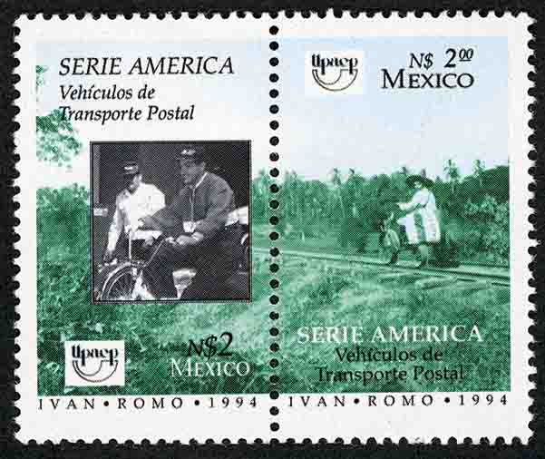 No. Scott: 1891 -- Año de Emisión: 1994 -- Valor Facial: 2.00 Nuevos Pesos -- Verde y negro -- Perforación: 13 1/4 x 13 1/2 -- Tipo de Impresión: Offset Timbre Postal Mexicano en colores verde y negro, en la imagen se observan dos timbres unidos en dibujo contínuo (CSE TENANT) formando pareja, ambos nos muestran vehículos de transporte postal, en el primero aparece el correo en bibicleta y en el segundo el correo en un armón ó carro de transporte de artillería, en cada estampilla está escrito "SERIE AMÉRICA", "Vehículos de Transporte Postal", el valor facial de "N$2.00", "MEXICO" e "IVAN, ROMO, 1994". Para más información favor de dirigirse a biblioteca@mufi.org.mx