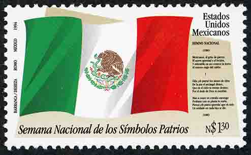 No. Scott: 1889 -- Año de Emisión: 1994 -- Valor Facial: 1.30 Nuevos Pesos -- Multicolor -- Perforación: 13 1/2 x 13 1/4 -- Tipo de Impresión: Offset Timbre Postal Mexicano multicolor, en la imagen aparece la Bandera Nacional Mexicana, en colores verde, blanco y rojo, a un costado del lado derecho aparece escrito "Estados Unidos Mexicanos y parte de la letra del Himno Nacional de México, en el costado izquierdo "BARRANCA / DEHEZA, ROMO MEXICO 1994", en la parte inferior "Semana Nacional de los Símbolos Patrios y el valor facial de "N$1.30". Para más información favor de dirigirse a biblioteca@mufi.org.mx