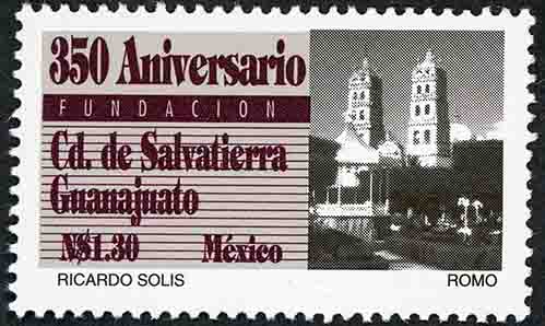 No. Scott: 1892 -- Año de Emisión: 1994 -- Valor Facial: 1.30 Nuevos Pesos -- Café rojizo y negro -- Perforación: 13 1/2 x 13 1/4 -- Tipo de Impresión: Offset Timbre Postal Mexicano en colores café rojizo y negro,del lado derecho de la imagen aparece la fachada de la Catedral de la Ciudad de Salvatierra, perteneciente al Estado de Guanajuato, del lado izquierdo está escrito "350 Aniversario", "FUNDACIÓN ", "Cd. de Salvatierra Guanajuato, el valor facial de "N$1.30", "MEXICO" y "RICARDO SOLIS ROMO". Para más información favor de dirigirse a biblioteca@mufi.org.mx