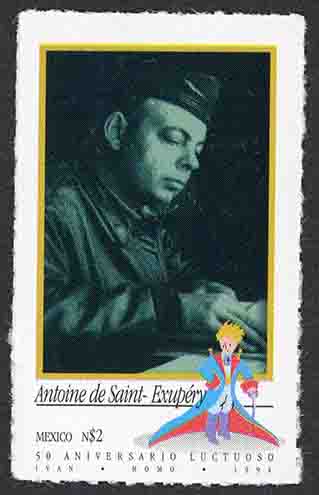 No. Scott: 1896 -- Año de Emisión: 1994 -- Valor Facial: 2.00 Nuevos Pesos -- Multicolor -- Perforación: 14 -- Tipo de Impresión: Offset Timbre Postal Mexicano multicolor, en la imagen aparece el retrato del aviador y escritor francés Antoine de Saint Exupéry, autor de la famosa obra El Principito, en la parte inferior está escrito "MEXICO", el valor facial de "N$2.00", "50 ANIVERSARIO LUCTUOSO", "IVAN ROMO 1994" y el personaje de El Principito". Para más información favor de dirigirse a biblioteca@mufi.org.mx