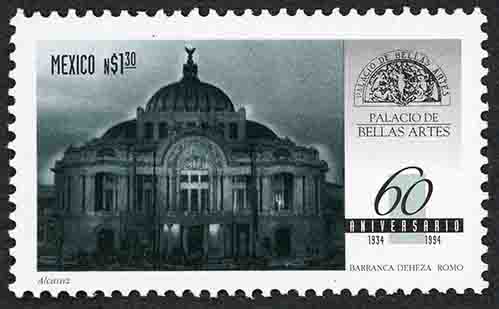 No. Scott: 1895 -- Año de Emisión: 1994 -- Valor Facial: 1.30 Nuevos Pesos -- Azul oscuro y negro -- Perforación: 13 1/2 x 13 1/4 -- Tipo de Impresión: Offset Timbre Postal Mexicano en colores azul oscuro y negro, del lado izquierdo aparece la fachada del edificio del Palacio de Bellas Artes, recinto cultural ubicado en la Ciudad de México, del lado derecho y en la parte superior se observa el escudo del recinto, "PALACIO DE BELLAS ARTES", "60 ANIVERSARIO 1934-1994" y "BARRANCA / DEHEZA ROMO". Para más información favor de dirigirse a biblioteca@mufi.org.mx