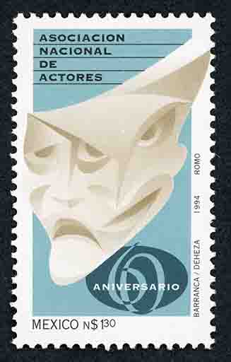 No. Scott: 1903 -- Año de Emisión: 1994 -- Valor Facial: 1.30 Nuevos Pesos -- Azul, Sepia y Negro -- Perforación: 13 1/4 x 13 1/2 -- Tipo de Impresión: Offset Timbre Postal Mexicano en colores azul, sepia y negro, en la imagen aparece un objeto en el cuál se aprecian dos rostros de seres imaginarios, en la parte superior está escrito "ASOCIACION NACIONAL DE AUTORES", en la parte inferior "60 ANIVERSARIO", "MEXICO", el valor facial de "N$1.30" y en el costado derecho "BARRANCA / DEHEZA, 1994, ROMO". Para más información favor de dirigirse a biblioteca@mufi.org.mx