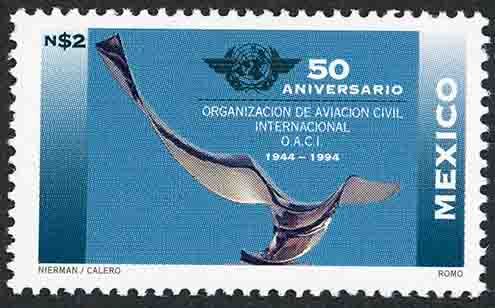 No. Scott: 1901 -- Año de Emisión: 1994 -- Valor Facial: 2.00 Nuevos Pesos -- Azul, gris y negro -- Perforación: 13 1/2 x 13 1/4 -- Tipo de Impresión: Offset Timbre Postal Mexicano en colores azul, gris y negro, al centro de la imagen se observa una escultura de metal, elaborada por el artista mexicano Leonardo Nierman titulada "El Vuelo", en la parte superior del lado izquierdo está el valor facial de "N$2.00", en el centro se aprecia un logotipo, "50 ANIVERSARIO", "ORGANIZACION DE AVIACION CIVIL INTERNACIONAL O.A.C.I." 1944-1994", en el costado derecho "MEXICO" y al interior "NIERMAN / CALERO, ROMO". Para más información favor de dirigirse a biblioteca@mufi.org.mx