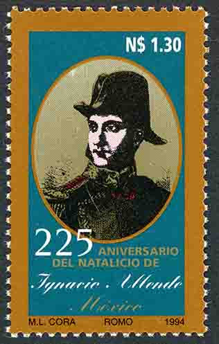 No. Scott: 1904 -- Año de Emisión: 1994 -- Valor Facial: 1.30 Nuevos Pesos -- Verde, negro, oro y café -- Perforación: 14 -- Tipo de Impresión: Offset Timbre Postal Mexicano en colores verde, negro, oro y café, en la imagen se observa el retrato de Ignacio Allende, militar mexicano, que participó en el movimiento de la Independecia de México, este retrato se centra en un óvalo con bordes en color oro, en la parte superior está escrito el valor facial de "N$1.30", en la parte inferior "225 ANIVERSARIO DEL NATALICIO DE Ignacio Allende", "MEXICO" y "M.L. CORA, ROMO, 1994". Para más información favor de dirigirse a biblioteca@mufi.org.mx