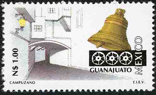 No. Scott: 1783 -- Año de Emisión: 1993 -- Valor Facial: N$ 1.00 -- Multicolor -- Perforación: 14 x 14 1/4 -- Tipo de Impresión: Huecograbado Timbre Postal Mexicano multicolor, perteneciente a la serie de México Turístico, del lado izquierdo se observan algunas casas y edificios sobre un callejón, del lado derecho y en primer plano aparece un instrumento sonoro en forma de copa o vaso invertido en color cobre llamado campana, sobre la estampilla está escrito el valor facial de N$ 1.00, "GUANAJUATO, MEXICO" y "CAMPUZANPO T.I.E.V.". Para más información favor de dirigirse a biblioteca@mufi.org.mx