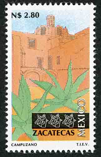 No. Scott: 1798 -- Año de Emisión: 1993 -- Valor Facial: N$ 2.80 -- Multicolor -- Perforación: 14 x 14 1/4 -- Tipo de Impresión: Huecograbado Timbre Postal Mexicano multicolor, perteneciente a la serie de México Turístico, al fondo de la imagen de observa de forma surrealista algunos edificios y en la parte frontal aparecen dos plantas de hojas triangulares, carnosas con terminación en punta, de nombre maguey, en la parte superior está escrito el valor facial de "N$ 2.80", en la parte inferior "ZACATECAS, MÉXICO" y "CAMPUZANO T.I.E.V.".