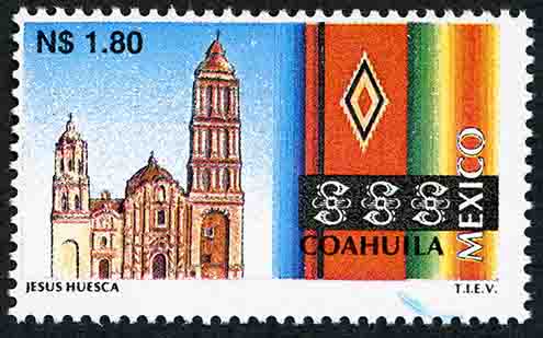 No. Scott: 1786 -- Año de Emisión: 1995 -- Valor Facial: N$ 1.80 -- Multicolor -- Perforación: 14 x 14 1/4 -- Tipo de Impresión: Huecograbado Timbre Postal Mexicano multicolor, perteneciente a la serie de México Turístico, del lado izquierdo de la imagen aparece la fachada de la catedral de Saltillo y del lado derecho se aprecia un textil artesanal de varios colores, sobre la estampilla está escrito el valor facial de "N$ 1.80", "COAHUILA MÉXICO" y "JESÚS HUESCA T.I.E.V.". Para más información favor de dirigirse a biblioteca@mufi.org.mx