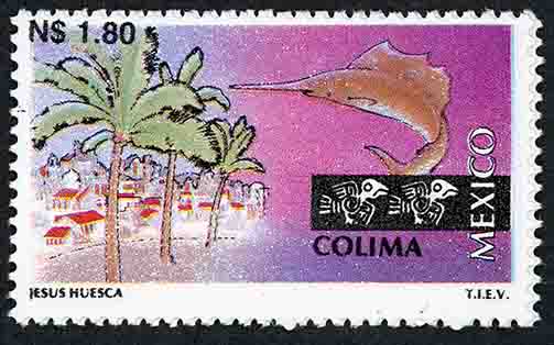 No. Scott: 1788 -- Año de Emisión: 1994 -- Valor Facial: N$ 1.80 -- Multicolor -- Perforación: 14 x 14 1/4 -- Tipo de Impresión: Huecograbado Timbre Postal Mexicano multicolor, perteneciente a la serie de México Turístico, del lado izquierdo se observa una área habitacional y tres palmeras al frente, del lado derecho aparece un pez espada de gran tamaño, caracterizado por su pico largo y aplanado, sobre la imagen está escrito el valor facial de "N$ 1.80", "COLIMA, MEXICO" y JESÚS HUESCA, T.I.E.V. Para más información favor de dirigirse a biblioteca@mufi.org.mx