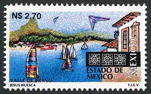 No. Scott: 1797 -- Año de Emisión: 1995 -- Valor Facial: N$ 2.70 -- Multicolor -- Perforación: 14 x 14 1/4 -- Tipo de Impresión: Huecograbado Timbre Postal Mexicano multicolor, perteneciente a la serie de México Turístico, al fondo de la imagen se aprecian montañas con mucha vegetación, al frente hay una gran extensión de agua y sobre de ésta, algunas velas de mar, del lado derecho, aparece una casa con grandes ventanales y techo de teja, en la parte superior está escrito el valor facial de "N$ 2.70", en la parte inferior "ESTADO DE MEXICO", "VALLE DE BRAVO" y "JESÚS HUESCA T.I.E.V.". Para más información favor de dirigirse a biblioteca@mufi.org.mx