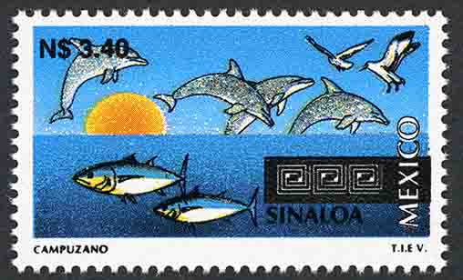 No. Scott: 1800 -- Año de Emisión: 1993 -- Valor Facial: N$ 3.70 -- Multicolor -- Perforación: 14 x 14 1/4 -- Tipo de Impresión: Huecograbado Timbre Postal Mexicano multicolor, perteneciente a la serie de México Turístico, en forma surrealista, la imagen nos proyecta el cielo, el mar y el sol, en la parte frontal aparecen animales mamíferos marinos, conocidos como delfines y algunas aves en vuelo, en la parte superior aparece escrito el valor facial de "N$ 3.70", en la parte inferior "SINALOA, MEXICO" y "CAMPUZANO T.I.E.V.". Para más información favor de dirigirse a biblioteca@mufi.org.mx