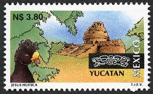No. Scott: 1801 -- Año de Emisión: 1995 -- Valor Facial: N$ 3.80 -- Multicolor -- Perforación: 14 x 14 1/4 -- Tipo de Impresión: Huecograbado Timbre Postal Mexicano multicolor, perteneciente a la serie de México Turístico, en forma surrealista, en la imagen aparece un complejo de ruinas, gran vegetación alrededor de éstas y al frente un ave de color negro y pico amarillo, sobre la estampilla está escrito el valor facial de "N$ 3.80", "YUCATÁN, MÉXICO" y "JESÚS HUESCA, T.I.E.V.". Para más información favor de dirigirse a biblioteca@mufi.org.mx