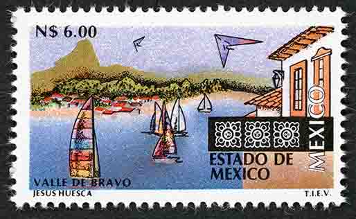 No. Scott: 1804 -- Año de Emisión: 1995 -- Valor Facial: N$ 6.00 -- Multicolor -- Perforación: 14 x 14 1/4 -- Tipo de Impresión: Huecograbado Timbre Postal Mexicano multicolor, perteneciente a la serie de México Turístico, al fondo de la imagen se aprecian montañas con mucha vegetación, al frente hay una gran extensión de agua y sobre de ésta, algunas velas de mar, del lado derecho, aparece una casa con grandes ventanales y techo de teja, en la parte superior está escrito el valor facial de "N$ 6.00", en la parte inferior "ESTADO DE MEXICO", "VALLE DE BRAVO" y "JESÚS HUESCA T.I.E.V.". Para más información favor de dirigirse a biblioteca@mufi.org.mx