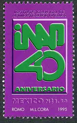 No. Scott: 1915 -- Año de Emisión: 1995 -- Valor Facial: N$ 1.80 -- Violeta, verde y negro -- Perforación: 13 1/4 x 13 1/2 -- Tipo de Impresión: Offset Timbre Postal Mexicano en colores violeta, verde y negro, al centro de la imagen y dentro de un rectángulo se observan las siglas INAP 40 ANIVERSARIO, en la parte superior está escrito "INSTITUTO NACIONAL DE ADMINISTRACIÓN PÚBLICA", en la parte inferior "MEXICO", el valor facial de "N$ 1.80" y "ROMO, M.L. CORA, 1995". Para más información favor de dirigirse a biblioteca@mufi.org.mx