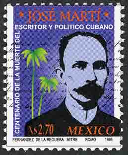 No. Scott: 1916 -- Año de Emisión: 1995 -- Valor Facial: N$ 2.70 -- Negro, Rojo, azul y verde -- Perforación: 13 1/2 x 13 1/4 -- Tipo de Impresión: Offset Timbre Postal Mexicano en colores negro, rojo, azul y verde, del lado derecho de la imagen aparece el retrato del escritor y político cubano José Julián Martí y Pérez, atrás de él de aprecian dos palmeras en color verde, en la estampilla está escrito "JOSÉ MARTÍ", "CENTENARIO DE LA MUERTE DEL ESCRITOR Y POLÍTICO CUBANO", el valor facial de "N$ 2.70", "MEXICO" y "FERNÁNDEZ DE LA REGUERA MITRE ROMO, 1995". Para más información favor de dirigirse a biblioteca@mufi.org.mx