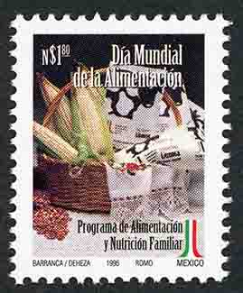 No. Scott: 1929 -- Año de Emisión: 1995 -- Valor Facial: N$ 1.80 -- Multicolor -- Perforación: 14 x 13 1/2 -- Tipo de Impresión: Offset Timbre Postal Mexicano multicolor, en medio se observa una canasta el color café, encima de ella una servilleta color blanco, del lado izquierdo hay tres elotes y a la derecha, algunas bolsas de leche, en la parte superior está escrito el valor facial de "N$ 1.80", "DIA MUNDIAL DE LA ALIMENTACIÓN", en la parte inferior "Programa de Alimentación y Nutrición Familiar" y "BARRANCA / DEHEZA, 1995, ROMO, MÉXICO". Para más información favor de dirigirse a biblioteca@mufi.org.mx