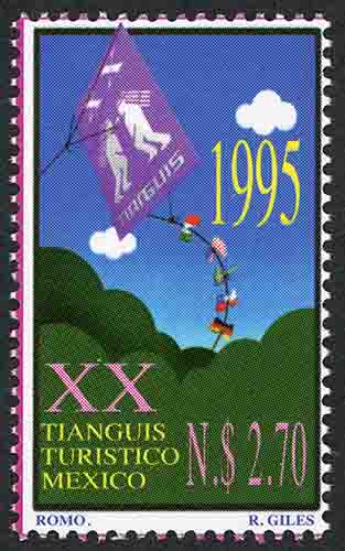 No. Scott: 1918 -- Año de Emisión: 1995 -- Valor Facial: N$ 2.70 -- Multicolor -- Perforación: 13 1/4 x 13 1/2 -- Tipo de Impresión: Offset Timbre Postal Mexicano multicolor, en la imagen se aprecia un paisaje surrealista, en la parte de abajo se observa una área montañosa y arriba un papalote volando, en la cola del papalote aparecen algunas banderas del mundo, sobre la estampilla está escrito "1995", "XX TIANGUIS TURÍSTICO MÉXICO, el valor facial de "N$ 2.70"y "ROMO, R. GILES". Para más información favor de dirigirse a biblioteca@mufi.org.mx