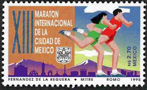 No. Scott: 1925 -- Año de Emisión: 1995 -- Valor Facial: N$ 2.70 -- Multicolor -- Perforación: 13 1/2 x 13 1/4 -- Tipo de Impresión: Offset Timbre Postal Mexicano multicolor, al fondo de la magen aparecen nubes y volcanes, al frente se vé el contorno de una ciudad y en primer plano hay dos corredores vestidos con ropa deportiva, sobre la estampilla está escrito "XIII MARATON INTERNACIONAL DE LA CIUDAD DE MÉXICO", el valor facial de "N$ 2.70", "MEXICO" y "FERNANDEZ DE LA REGUERA, MITRE, ROMO 1995". Para más información favor de dirigirse a biblioteca@mufi.org.mx