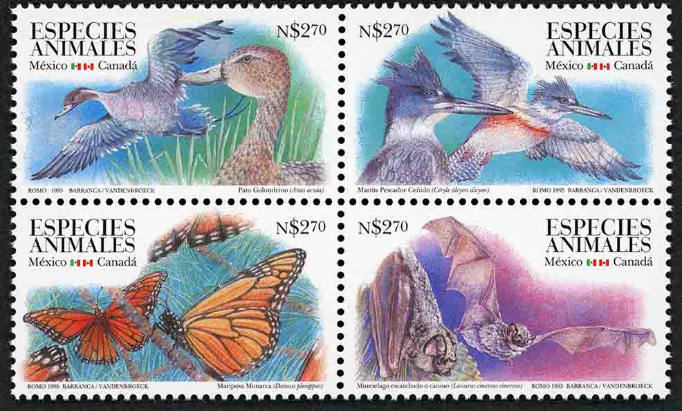 No. Scott: 1924 -- Año de Emisión: 1995 -- Valor Facial: N$ 2.70 -- Multicolor -- Perforación: 13 1/2 x 13 1/4 -- Tipo de Impresión: Huecograbado Block de cuatro Timbres Postales Mexicanos multicolores, alusivos a la emisión conjunta México-Canadá, Especies Animales, en el primer timbre aparece el Pato Golondrino, en el segundo la Mariposa Monarca, en el tercero el Murciélago Escarchado y en el último Martín Pescador, en cada estampilla está escrito "ESPECIES ANIMALES", "México- Canadá" y el valor facial de "N$2.70". Para más información favor de dirigirse a biblioteca@mufi.org.mx