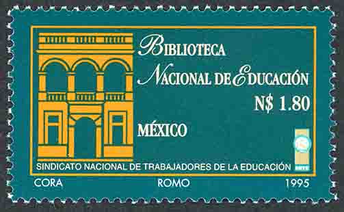 No. Scott: 1948 -- Año de Emisión: 1995 -- Valor Facial: N$ 1.80 -- Verde oocuro y oro -- Perforación: 13 1/2 x 13 1/4 -- Tipo de Impresión: Offset Timbre Postal Mexicano en colores verde oscuro y oro, en él aparece una ilustración surrealista, dando forma a la fachada de un edificio elaborada por una variedad de líneas rectas, onduladas y curvas en diferentes tamaños, sobre la estampilla está escrito "BIBLIOTECA NACIONAL DE EDUCACIÓN", el valor facial de "N$ 1.80", "MÉXICO", "SINDICATO NACIONAL DE TRABAJADORES DE LA EDUCACIÓN" y "CORA, ROMO, 1995". Para más información favor de dirigirse a biblioteca@mufi.org.mx