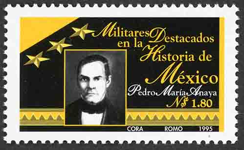No. Scott: 1940 -- Año de Emisión: 1995 -- Valor Facial: N$ 1.80 -- Negro y amarillo -- Perforación: 13 1/2 x 13 1/4 -- Tipo de Impresión: Offset Timbre Postal Mexicano en colores negro y Amarillo, en la imagen se observa el retrato del militar mexicano Pedro María Anaya, sobre la estampilla está escrito "Militares Destacados en la Historia de México", ¨Pedro María Anaya", el valor facial de "N$ 1.80" y "CORA, ROMO 1995". Para más información favor de dirigirse a biblioteca@mufi.org.mx