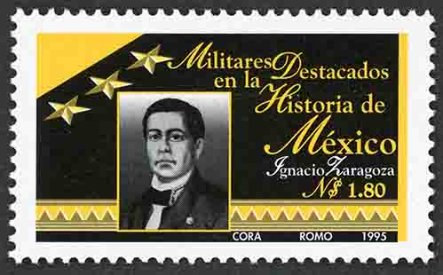 No. Scott: 1937 -- Año de Emisión: 1995 -- Valor Facial: N$ 1.80 -- Negro y amarillo -- Perforación: 13 1/2 x 13 1/4 -- Tipo de Impresión: Offset Timbre Postal Mexicano en colores negro y amarillo, en la imagen se observa el retrato del militar mexicano Ignacio Zaragoza, sobre la estampilla está escrito "Militares Destacados en la Historia de México", "Ignacio Zaragoza", el valor facial de "N$ 1.80" y "CORA, ROMO 1995". Para más información favor de dirigirse a biblioteca@mufi.org.mx