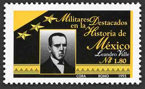 No. Scott: 1941 -- Año de Emisión: 1995 -- Valor Facial: N$ 1.80 -- Negro y amarillo -- Perforación: 13 1/2 x 13 1/4 -- Tipo de Impresión: Offset Timbre Postal Mexicano en colores negro y amarillo, en la imagen se observa el retrato del militar mexicano Leandro Valle , sobre la estampilla está escrito "Militares Destacados en la Historia de México", "Leandro Valle", el valor facial de "N$ 1.80" y "CORA, ROMO 1995". Para más información favor de dirigirse a biblioteca@mufi.org.mx