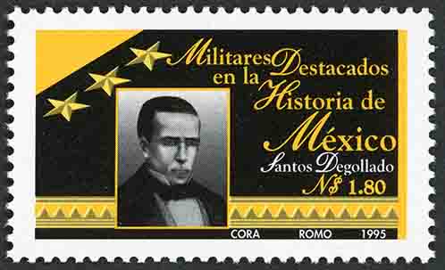 No. Scott: 1942 -- Año de Emisión: 1995 -- Valor Facial: N$ 1.80 -- Negro y amarillo -- Perforación: 13 1/2 x 13 1/4 -- Tipo de Impresión: Offset Timbre Postal Mexicano en colores negro y amarillo, en la imagen se observa el retrato del militar mexicano Santos Degollado , sobre la estampilla está escrito "Militares Destacados en la Historia de México", "Santos Degollado", el valor facial de "N$ 1.80" y "CORA, ROMO 1995". Para más información favor de dirigirse a biblioteca@mufi.org.mx