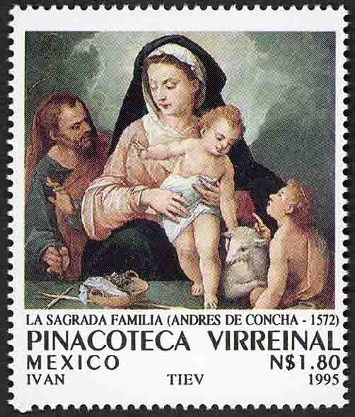 No. Scott: 1936 -- Año de Emisión: 1995 -- Valor Facial: N$ 1.80 -- Multicolor -- Perforación: 14 -- Tipo de Impresión: Offset Timbre Postal Mexicano multicolor, en la imagen aparece la obra del pintor español Andrés de la Concha, titulada "La Sagrada Familia", sobre la estampilla está escrito "LA SAGRADA FAMILIA (ANDRÉS DE LA CONCHA-1572", "PINACOTECA VIRREINAL", "MÉXICO", el valor facial de "N$ 1.80" e "IVAN, T.I.E.V. 1995). Para más información favor de dirigirse a biblioteca@mufi.org.mx