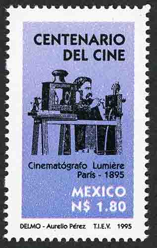No. Scott: 1947 -- Año de Emisión: 1995 -- Valor Facial: N$ 1.80 -- Violeta y negro -- Perforación: 14 -- Tipo de Impresión: Offset Timbre Postal Mexicano en colores violeta y negro, en la imagen aparece el cinematógrafo frances Louis Lumière, con un proyector de películas en modo proyección, en la parte superior está escrito "CENTENARIO DEL CINE", en la parte inferior "Cinematógrafo Lumière, París - 1895", "MÉXICO", el valor facial de "N$ 1.80" y "DELMO - Aurelio Pérez, T.I.E.V. 1995". Para más información favor de dirigirse a biblioteca@mufi.org.mx