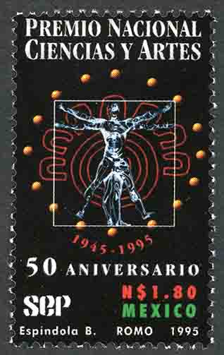 No. Scott: 1949 -- Año de Emisión: 1995 -- Valor Facial: N$ 1.80 -- Multicolor -- Perforación: 13 1/4 x 13 1/2 -- Tipo de Impresión: OffsetTimbre Postal Mexicano multicolor, al fondo de la imagen aparece un espiral y algunas líneas curvas en forma de "U", enfrente dos siluetas humanas, una está parada con brazos y piernas extendidas y la otra se está agachada, estas figuras se centran en un cuadro, alrededor se observan varias pelotitas en color naranja, en la parte superior está escrito "PREMIO NACIONAL CIENCIAS Y ARTES", en el inferior "1945-1995", "50 Aniversario", "SEP", "MÉXICO", el valor facial de "N$ 1.80" y "Espíndola B, ROMO, 1995".
