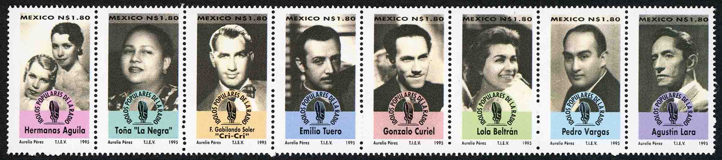 No. Scott: 1950a-h -- Año de Emisión: 1995 -- Valor Facial: N$ 1.80 -- Multicolor -- Perforación: 13 1/2 x 13 1/4 -- Tipo de Impresión: Offset Tira de ocho Timbres Postales de México, alusivos a los Ídolos Populares de la Radio en México, en ella aparecen: Las Hermanas Águila, Agustín Lara, Gonzalo Curiel, Francisco Gabilondo Soler, Pedro Vargas, Toña la Negra, Emilio Tuero y Lola Beltran, en cada estampilla aparece el valor facial de "N$ 1.80", "IDOLOS POPULARES DE LA RADIO", el nombre del artísta y "AURELIO PERÉZ, T.I.E.V. 1995". Para más información favor de dirigirse a biblioteca@mufi.org.mx