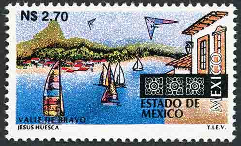 No. Scott: 1966 -- Año de Emisión: 1995 -- Valor Facial: N$ 2..70 -- Multicolor -- Perforación: 14 x 14 1/4 -- Tipo de Impresión: Huecograbado Timbre Postal Mexicano multicolor, perteneciente a la serie de México Turístico, al fondo de la imagen se aprecian montañas con mucha vegetación, al frente hay una gran extensión de agua y sobre de ésta, algunas velas de mar, del lado derecho, aparece una casa con grandes ventanales y techo de teja, en la parte superior está escrito el valor facial de "N$ 2.70", en la parte inferior "ESTADO DE MEXICO", "VALLE DE BRAVO" y "JESÚS HUESCA T.I.E.V.". Para más información favor de dirigirse a biblioteca@mufi.org.mx