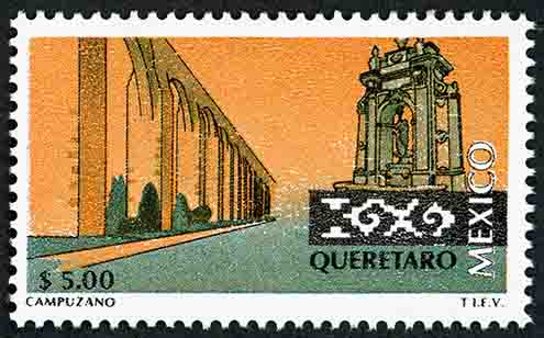 No. Scott: 1975 -- Año de Emisión: 1997 -- Valor Facial: $ 5.00 -- Multicolor -- Perforación: 14 x 14 1/4 -- Tipo de Impresión: Huecograbado Timbre Postal Mexicano multicolor, perteneciente a la serie de México Turístico, en forma surrealista y del lado izquierdo de la imagen aparece un edificio monumental con arcos y un poco de vegetación, del lado derecho se observa un monumento histórico, sobre la estampilla está escrito el valor facial de "$ 5.00", "QUERÉTARO, MÉXICO" y "CAMPUZANO T.I.E.V.". Para más información favor de dirigirse a biblioteca@mufi.org.mx
