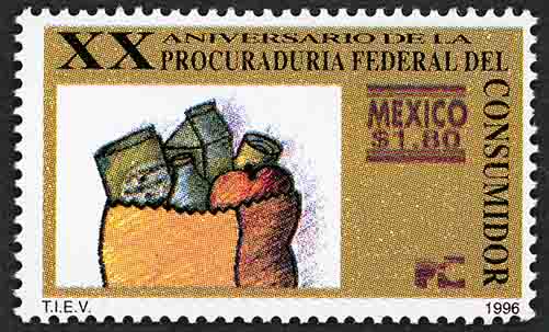 No. Scott: 1956 -- Año de Emisión: 1996 -- $1.80 -- Café, negro y sepia -- Perforación: 14 -- Tipo de Impresión: Offset Timbre Postal Mexicano multicolor, en un rectángulo de fondo blanco aparece una bolsa con productos, entre los cuales se distinguen algunas botellas, cajas y frutas, sobre el contorno está escrito "XX ANIVERSARIO DE LA PROCURADURÍA FEDERAL DEL CONSUMIDOR", "MÉXICO", el valor facial de "$ 1.80" y "T.I.E.V. 1996". Para más información favor de dirigirse a biblioteca@mufi.org.mx
