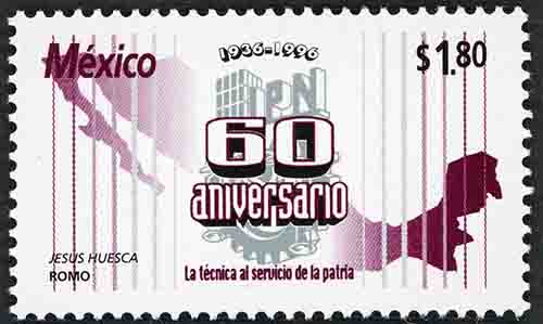 No. Scott: 1983 -- Año de Emisión: 1996 -- $1.80 -- Negro y ocre -- Perforación: 13 1/2 -- Tipo de Impresión: Offset Timbre Postal Mexicano en colores negro y ocre, sobre la imagen aparece el mapa de la República Mexicana, en medio se aprecia un edificio, las siglas IPN, en toda la estampilla hay líneas delgadas rectas y sobre de ésta escrito "MÉXICO", "1936-1996", el valor facial de "$ 1.80", "60 aniversario", "La técnica al servicio de la patria" y "JESÚS HUESCA ROMO". Para más información favor de dirigirse a biblioteca@mufi.org.mx