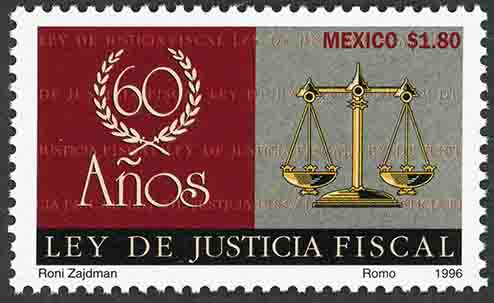 No. Scott: 1988 -- Año de Emisión: 1996 -- $1.80 -- Multicolor -- Perforación: 13 1/2 -- Tipo de Impresión: Offset Timbre Postal Mexicano multicolor, al fondo de la imagen aparecen los colores vino y gris, del lado izquierdo hay una guirnalda y en medio el número 60, abajo la palabra "Años", del lado derecho está una balanza en color amarillo, sobre la estampilla está escrito "MÉXICO", el valor facial de "$ 1.80", ".LEY DE JUSTICIA FISCAL" y "Roni Zadman, Romo, 1996". Para más información favor de dirigirse a biblioteca@mufi.org.mx
